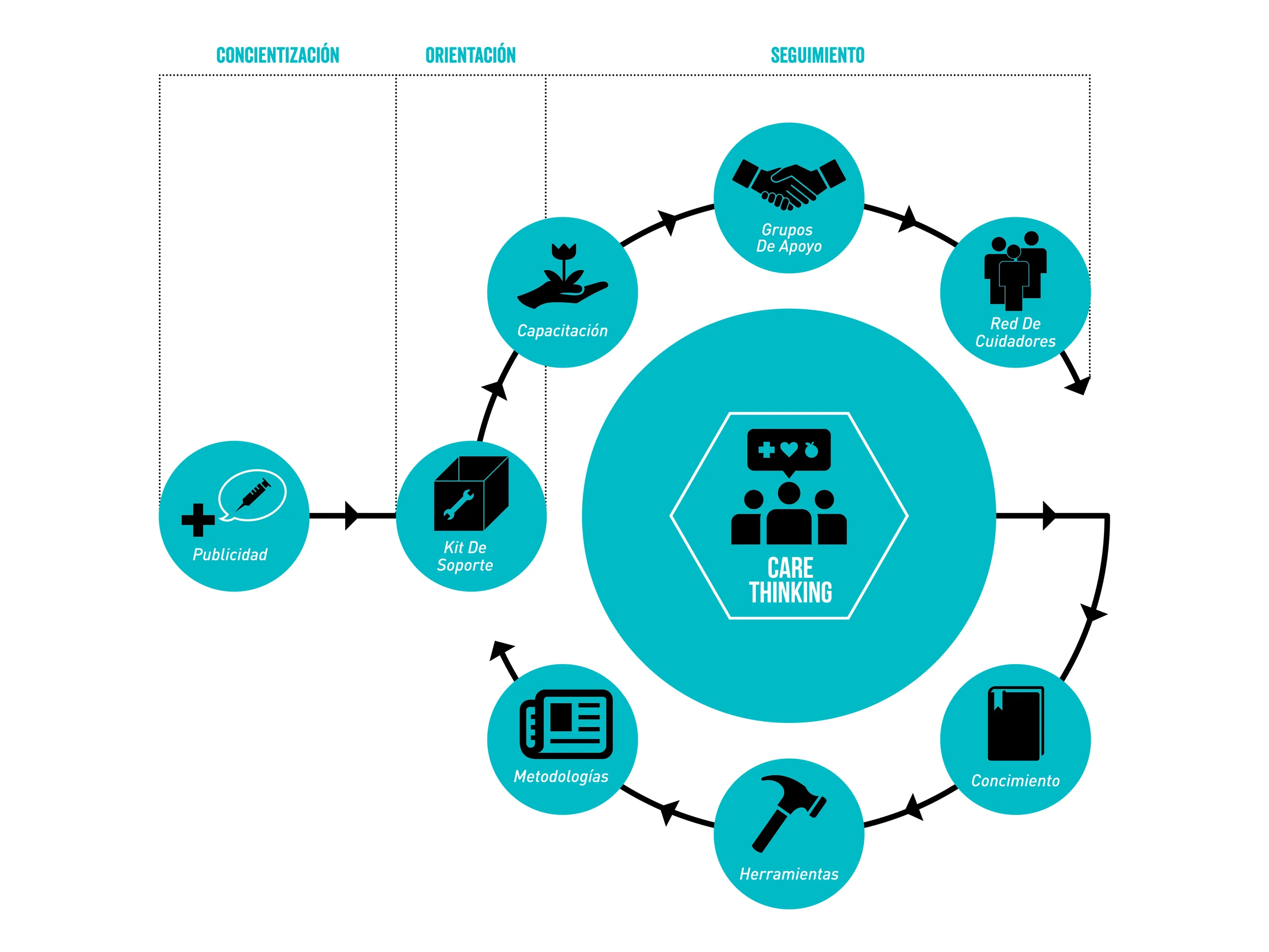 The engine of the whole system is called “Care Thinking”. In order to fully optimize the potential of the solution, an innovation mechanism was designed, where caregivers and professionals from different fields like architecture and design gather in co-creation sessions where wisdom and ideas meet to generate usable tools that can be appropriated by the members of the community at the beginning of the cycle.